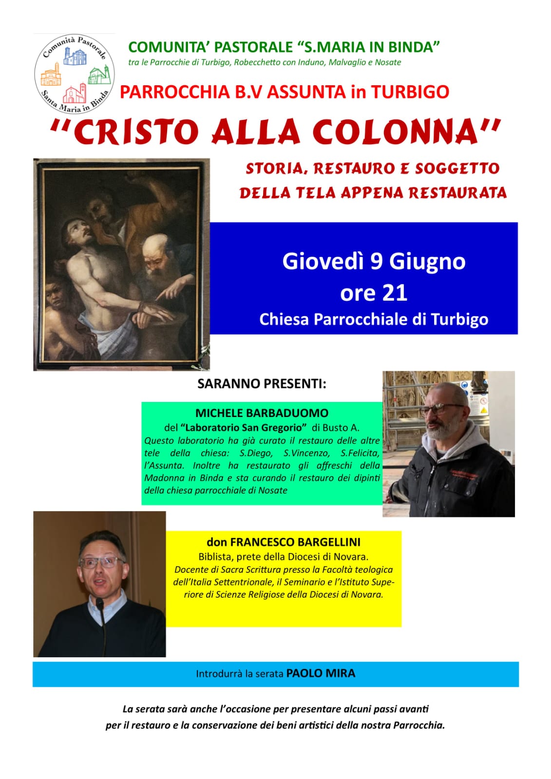 Giovedì 9 giugno alle 21 presso la parrocchia Beata Vergine Assunta di Turbigo, si terrà un interessante incontro con Michele Barbaduomo e don Francesco Bargellini sulla preziosa tela del Cristo alla Colonna, recentemente restaurata.