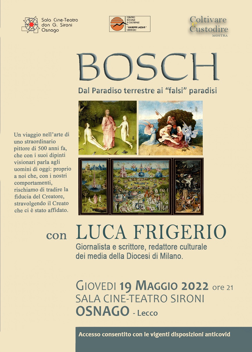 Nell’ambito dell’esposizione artistica ci sarà la possibilità di approfondire la conoscenza di un grande pittore: Hieronymus Bosch: Luca Frigerio, giornalista, scrittore e critico, introdurrà nel mondo di questo genio della pittura, attraverso una serata, il 19 maggio, dal titolo: “Bosch, dal Paradiso terrestre ai “falsi” paradisi. La conferenza si svolgerà alle ore 21, nella sala cine-teatro don G. Sironi, di via Gorizia ad Osnago.