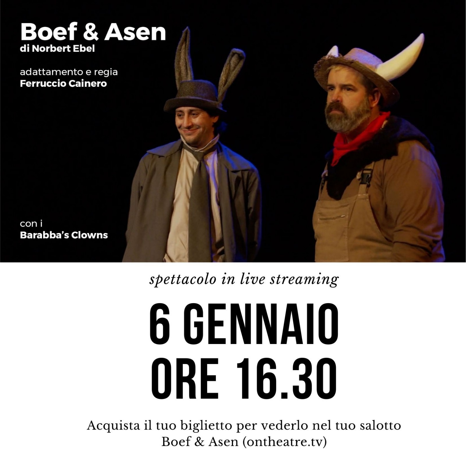 I Barabba’s Clowns di Arese presentano lo spettacolo Boef & Asen, di Norbert Ebel, adattamento e regia di Ferruccio Cainero, con i Barabba’s Clowns. Uno spettacolo adatto a spettatori dai 5 ai 90 anni, a cui si potrà assistere live in streaming giovedì 6 gennaio alle 16.30 e successivamente online, prenotando il proprio biglietto sulla piattaforma di teatro in streaming On Theatre a questo link.